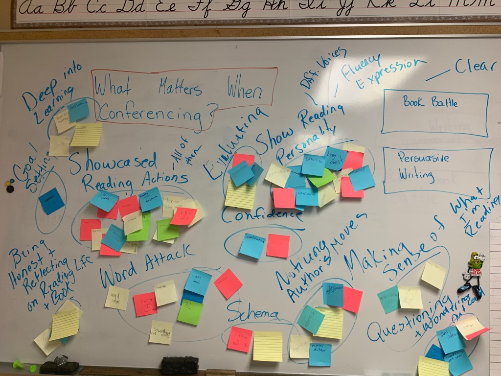 3. Co-Constructing Success Criteria – We do this for everything! We usually do it at the beginning of a unit or when we are looking into a top priority in our leadership. Co-constructing criteria is a learner centered process that encourages learners to construct their own understandings of what counts in quality work. When learners know what counts, they are able to set goals, self assess and improve their work. It is essentially backwards planning. It’s going over a model or an assignment and co-constructing through conversation and modelling how to be successful on it. I like to think of it as unpacking steps and criteria that should be included for the learner to be successful. In my leadership, this might look like modelling a workshop mini lesson and wondering out loud while teachers write down the criteria that they notice me do to build an engaging mini lesson. Teachers have written a part of a story in front of the student wondering out loud, while the students notice the criteria the teacher did to make the story interesting. We build criteria for many things, such as what is important when contributing to professional discussions and learning. What counts as high quality report card comments? What is important when conferencing with students? These are just a few examples. Through building criteria it gives the learner a roadmap of what to include to be successful and it gives them the language to assess their own work and give feedback to others. There is no one way to co-construct criteria but I like to do it using sticky notes and modelling.